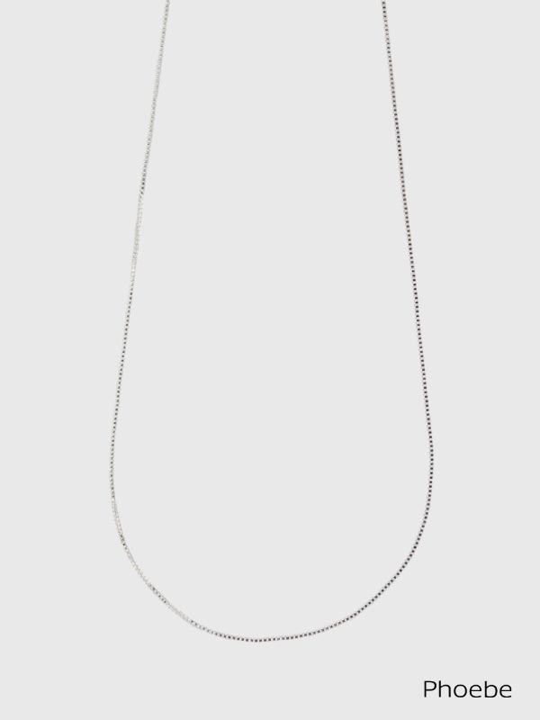 首元には、シルクのように輝くベネチアンチェーンのシルバーネックレス。