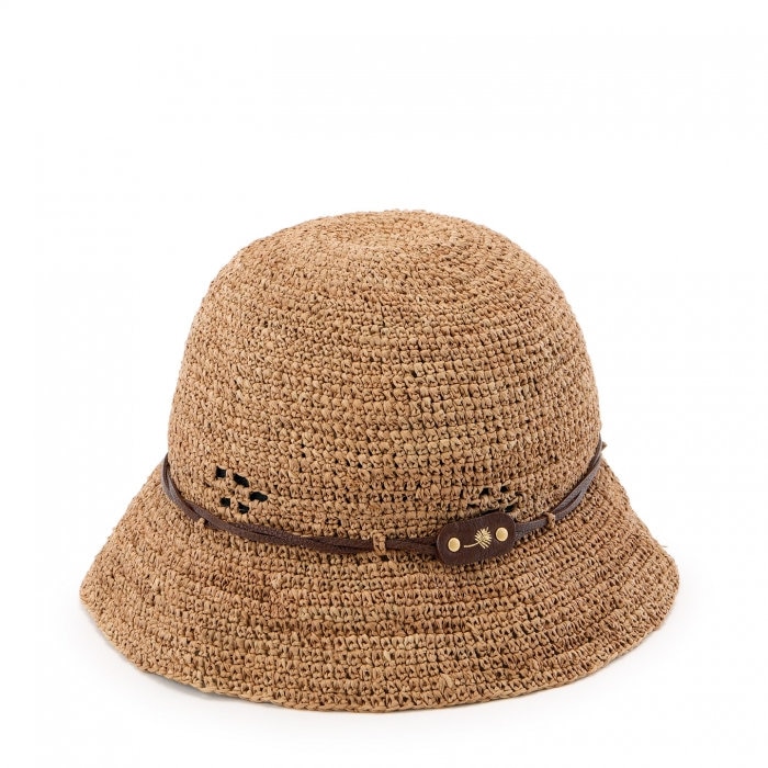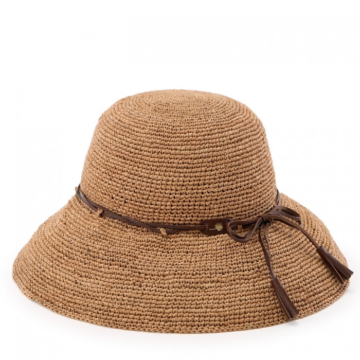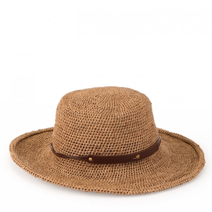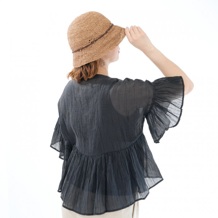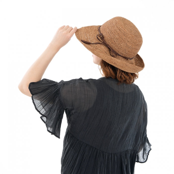 透け感のある編み目が涼やかな印象を添え、やわらかなつばが強い日差しをやさしく和らげてくれるラフィアハット。