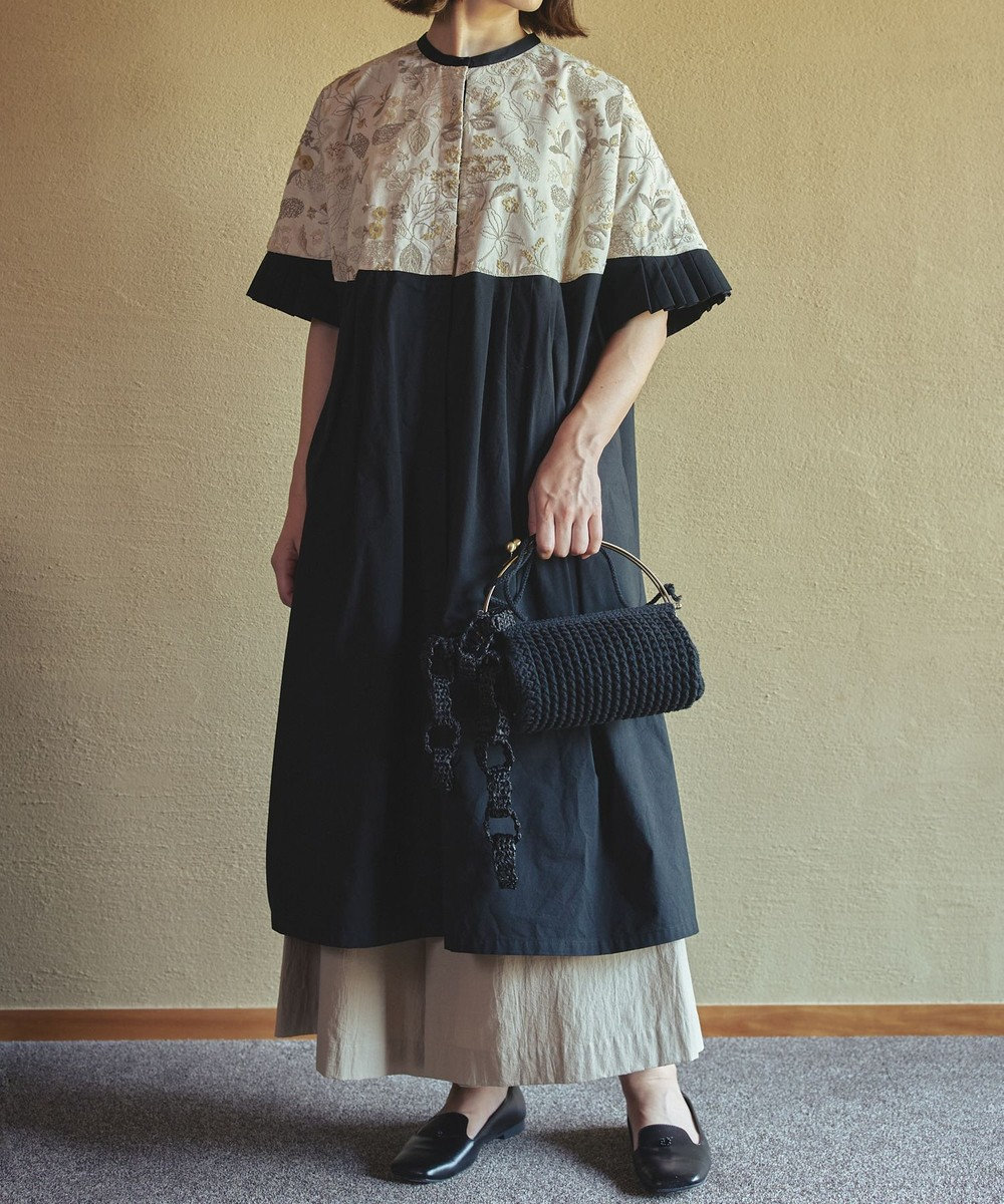 muucの人気テキスタイル【筆記帳刺繍】の生地を、丸ヨーク部分にあしらったワンピースドレスです。