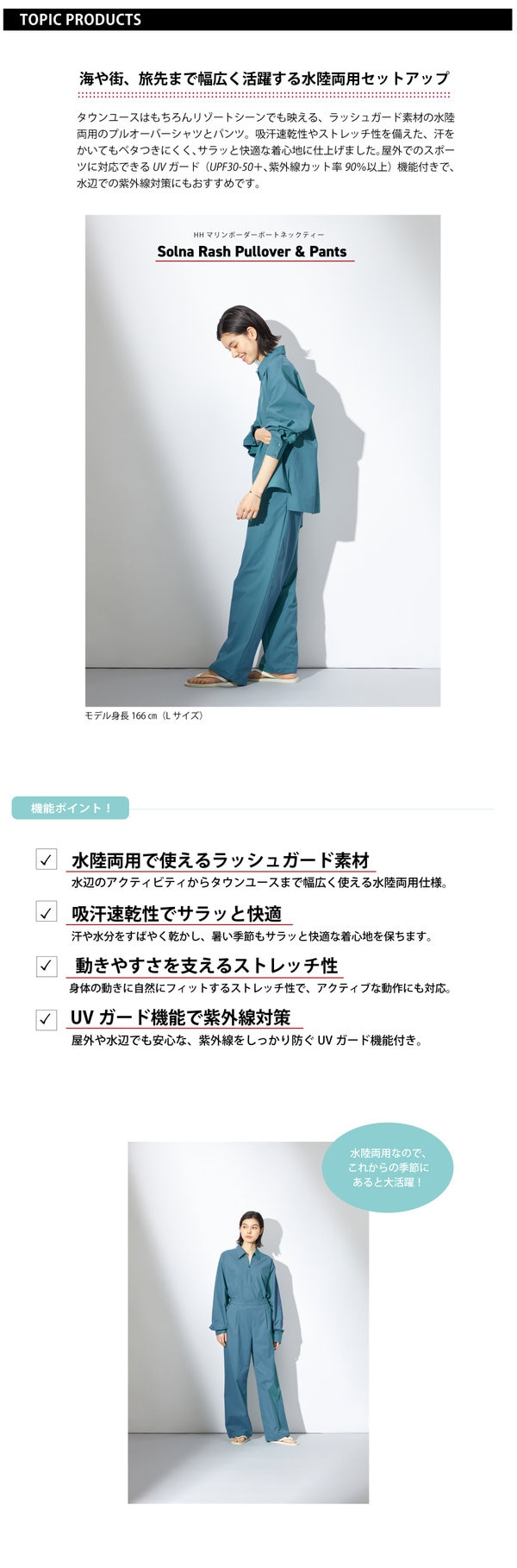 水辺のアクティビティから日常使いまでシームレスに楽しめる水陸両用ウエア「ソルナッシュシリーズ」。軽量で乾きやすい素材を使用し、濡れてもさらりとした着心地が続くのが魅力です。プルオーバーは程よくゆとりのあるシルエットで動きやすく、紫外線対策にも配慮した設計。ロングパンツはすっきりとしたラインながらストレッチ性があり、移動の多いシーンでも快適です。海や川でのレジャー、キャンプや旅行、街でのワンマイルウエアまで、これからの季節に頼れる一着。セットでも単品でも着回しやすく、アクティブ派の日常をスマートに支えます。