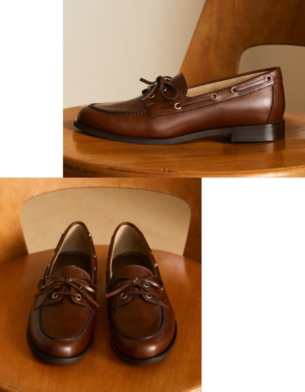 ウォームトーンのブラウンは足元に優しい印象を与え、ゴールドのアイレットがさりげないアクセントとなってほどよい遊び心をプラス。