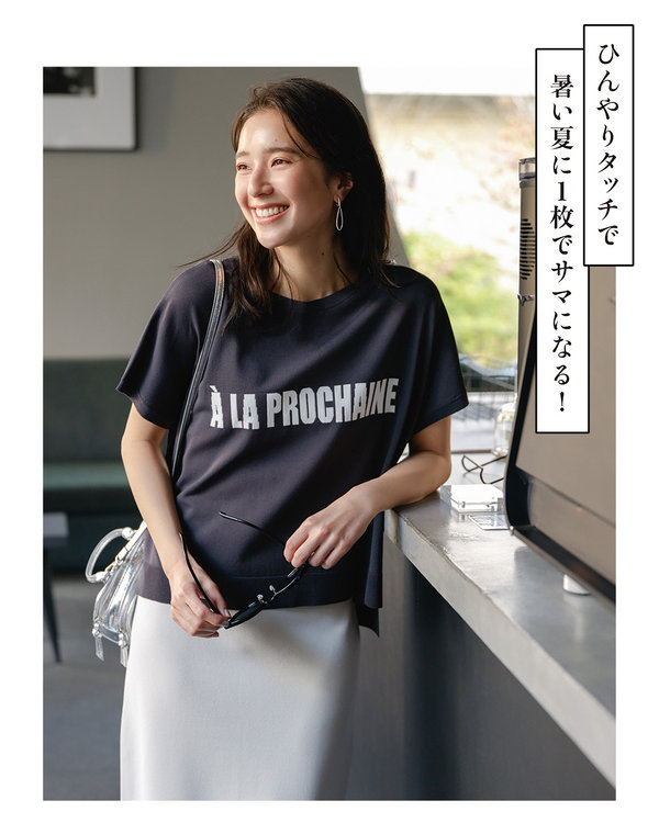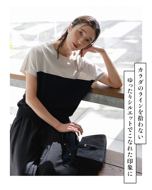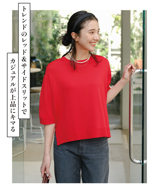 Tシャツ感覚で着られるデザインながら、ニットの光沢感でキレイ見えを叶えてくれる一枚です。
