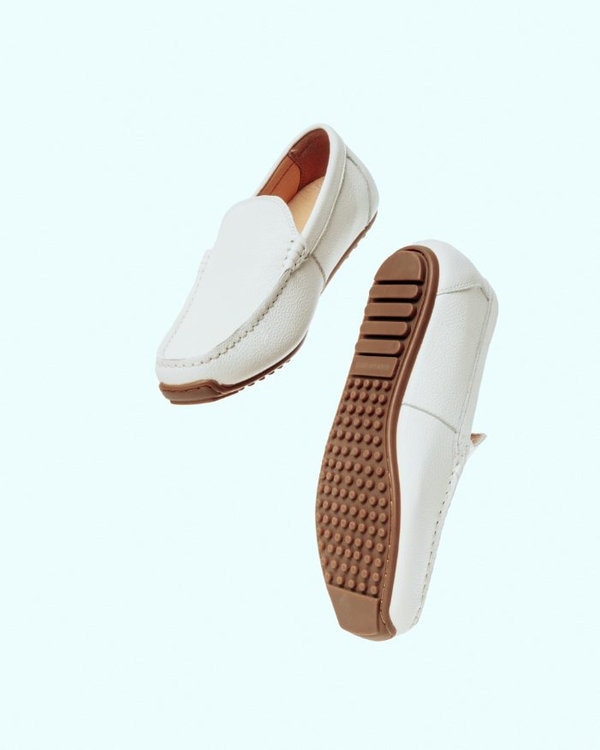 スニーカーの白とは異なる、レザーの上品さが、足元から装いを明るく照らします。