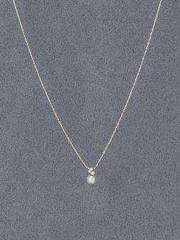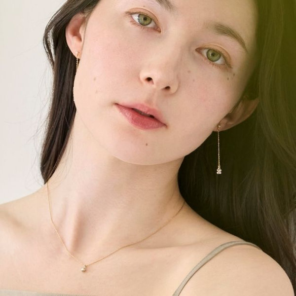 繊細な輝きを放つチェーンの先で揺れる、小粒のパールが愛らしい、ネックレスとイヤリングのコーディネート。