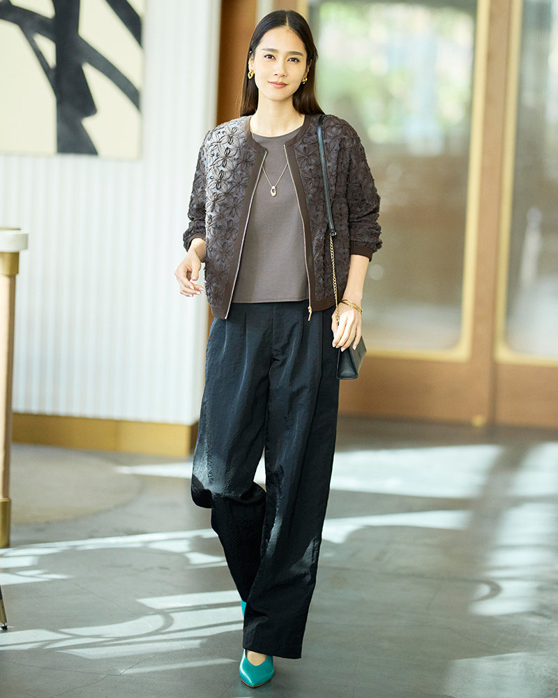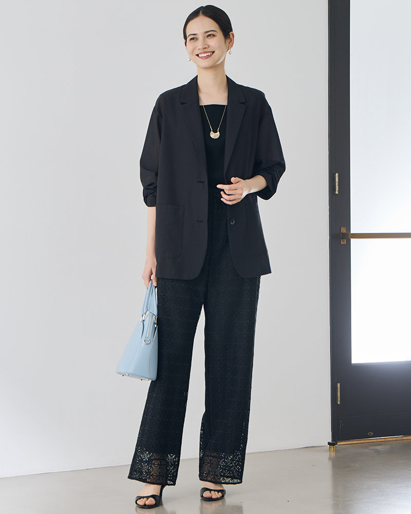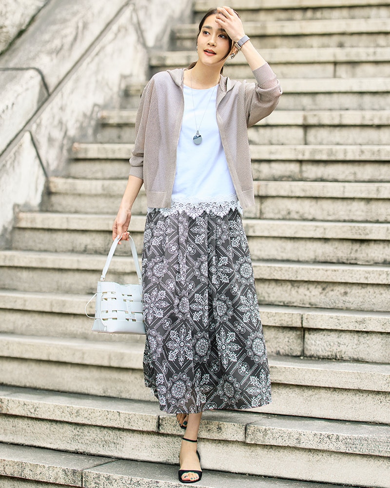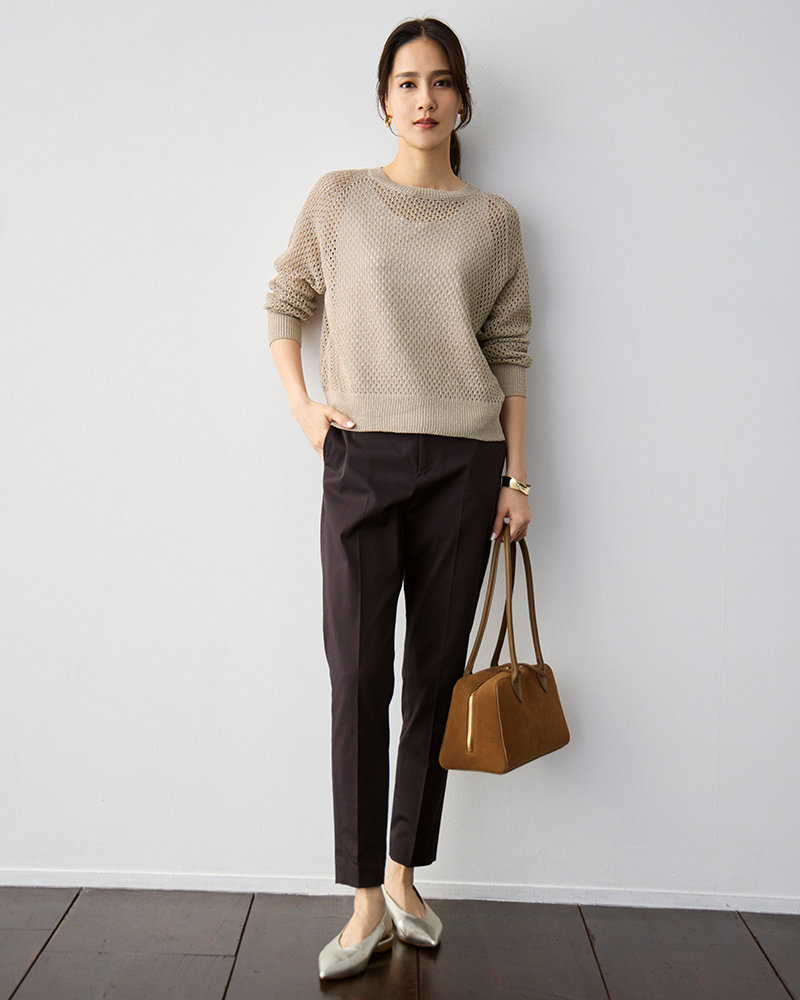トレンドのメッシュニットやシアーアイテムをより美しく見せる、計算されたレングスやシルエット。