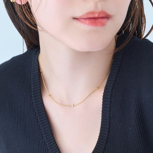 デコルテに沿うように流れるさり気ない輝きが、シンプルな装いのアクセントに。