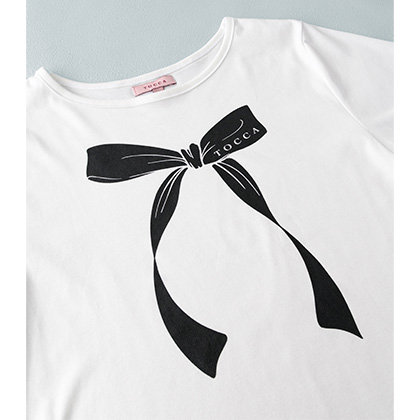 フロントにあしらわれたリボンモチーフが印象的な、大人フェミニンな半袖Tシャツ。