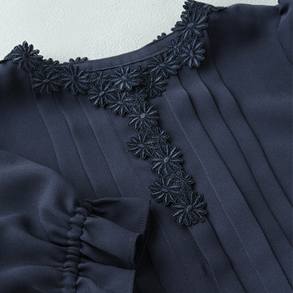 ネックラインから縦にあしらわれた立体的なフラワーモチーフがポイント。
