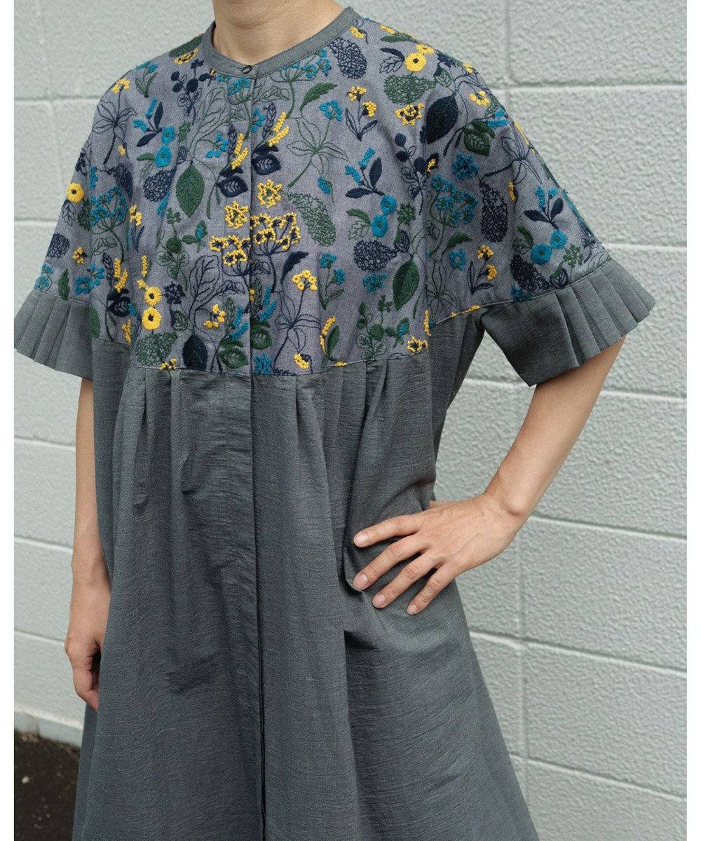 muucの人気テキスタイル【筆記帳刺繍】の生地を、丸ヨーク部分にあしらったワンピースドレスです。