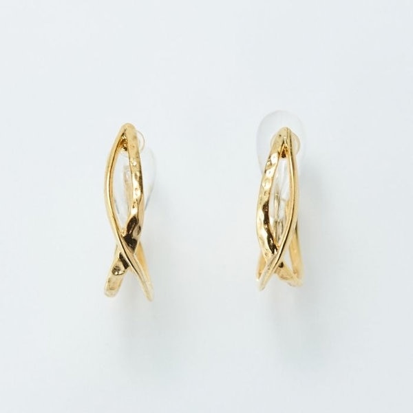 華奢なゴールドのクロスラインが女性らしい輝きを放つ、フープイヤリング。