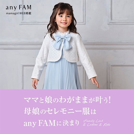 親子でトレンドアイテムのお揃いコーデやリンクコーデが楽しめると人気のany FAMは、セレモニーコーデもお任せ!ママもキッズもしっかりきちんと見えする服は、快適な着心地と着用後のお手入れもイージーケアで機能性もバッチリ!おしゃれ大好きな二人で一緒にコーディネートを楽しんでみてはいかが?