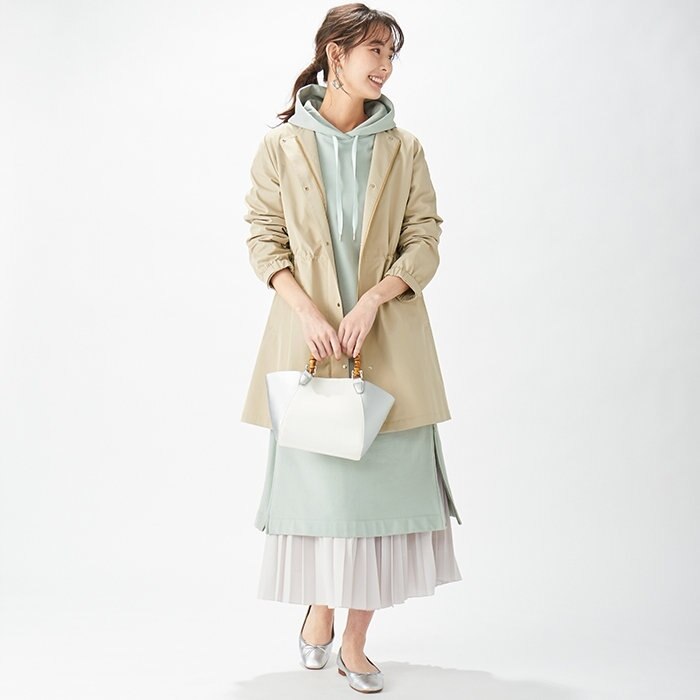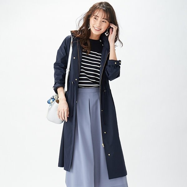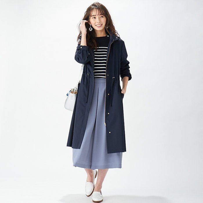 ロング丈タイプは、裾に向かって緩やかなAラインシルエットで、ウエストのドロストを絞れば、さらに女性らしさがぐっと際立つデザインです。