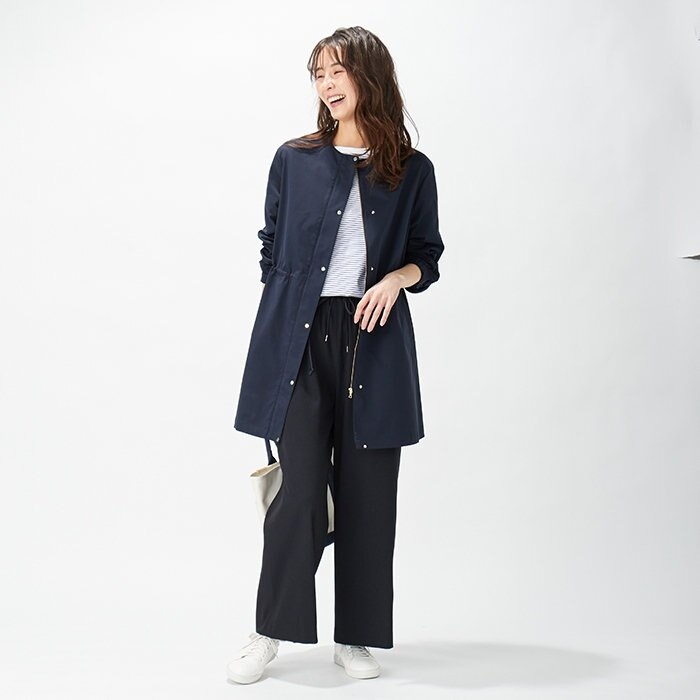ノーカラーデザインのミドル丈タイプは、ヒップがすっぽり隠れるゆったりシルエット。