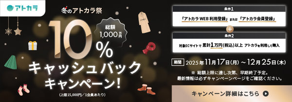 <総額上限1,000万円>冬のアトカラ祭!10%キャッシュバックキャンペーン!